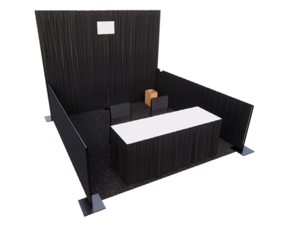 - 8’ high x 20’ x 20’ enclosed room, single locking door, (2) 5’ conference table, (8) chairs, carpet, (1) 10amp electrical outlets